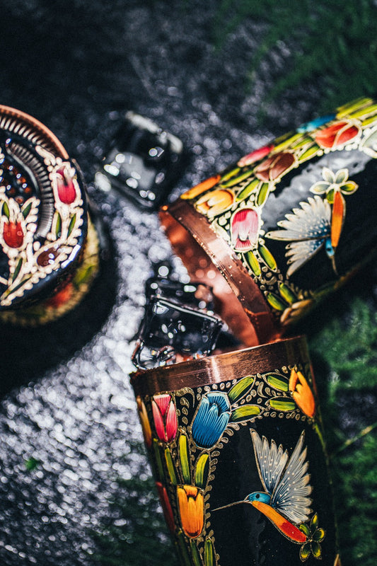 Cobbler Hand Painted Colibrí Negro 078Discover the pure essence of our cobbler, crafted from authentic copper and meticulously handcrafted by local artisans. Each piece not only enhances your cocktail-making experience but also honors the natural beauty of copper and the sustainability of its production. Immerse yourself in Mexican rich...