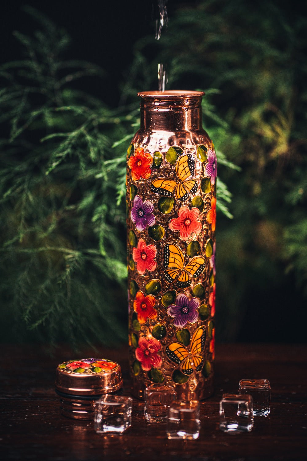 Our handpainted copper water bottle combines exceptional art and functionality. Every detail reflects the dedication of our craftsmen, highlighting the natural beauty with an ergonomic and practical design. It is perfect to accompany you on any occasion, being more than a vessel: it is an expression of Mexican craftsmanship and a tribute to the connection with nature.