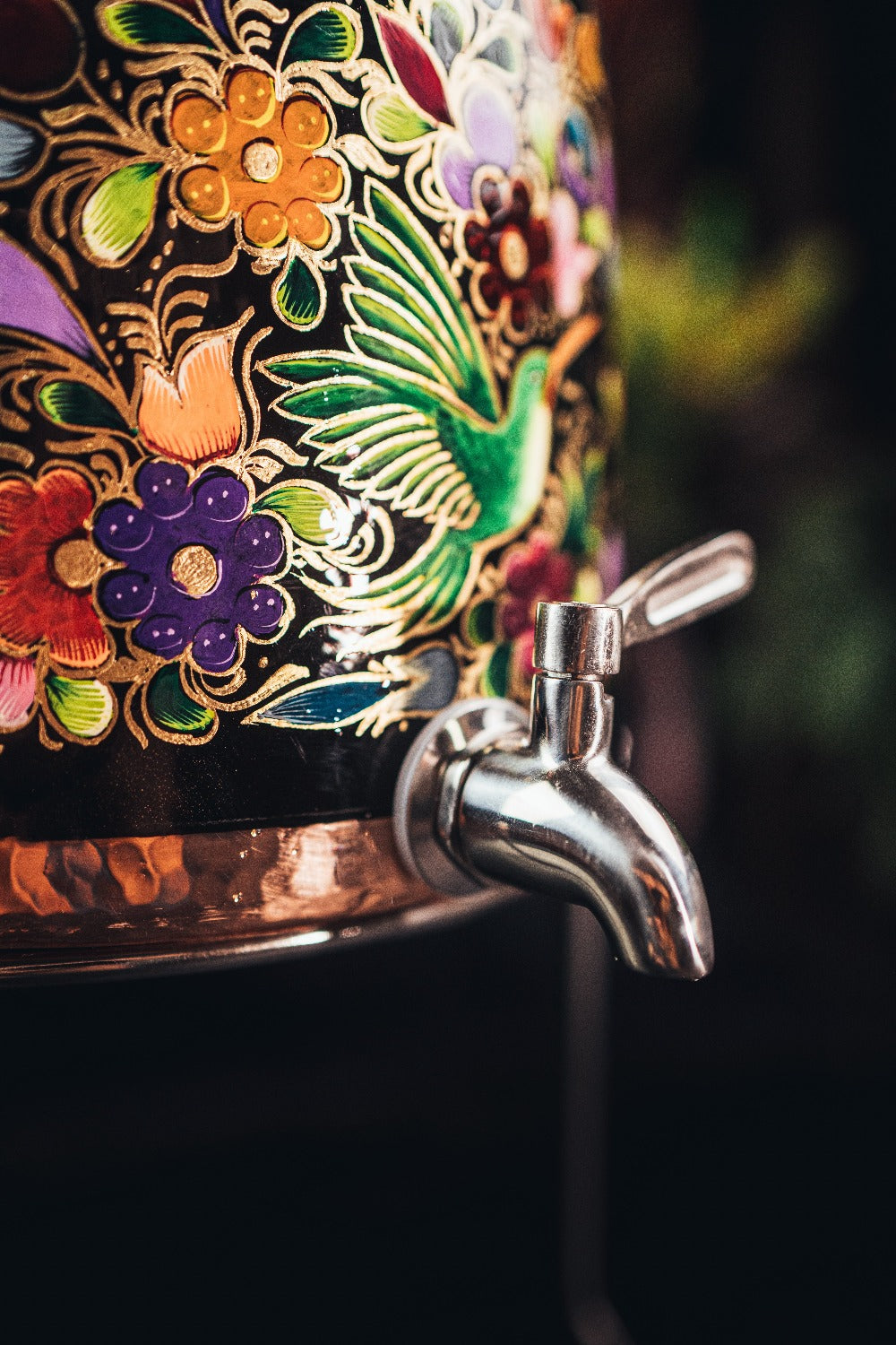 Our handcrafted, hand-painted copper water dispenser combines aesthetic beauty with exceptional functionality. Every detail reflects the skill of our Mexican artisans, providing both elegance and practicality in any environment. It is the ideal choice for those who appreciate traditional art and quality in every sip of fresh water.