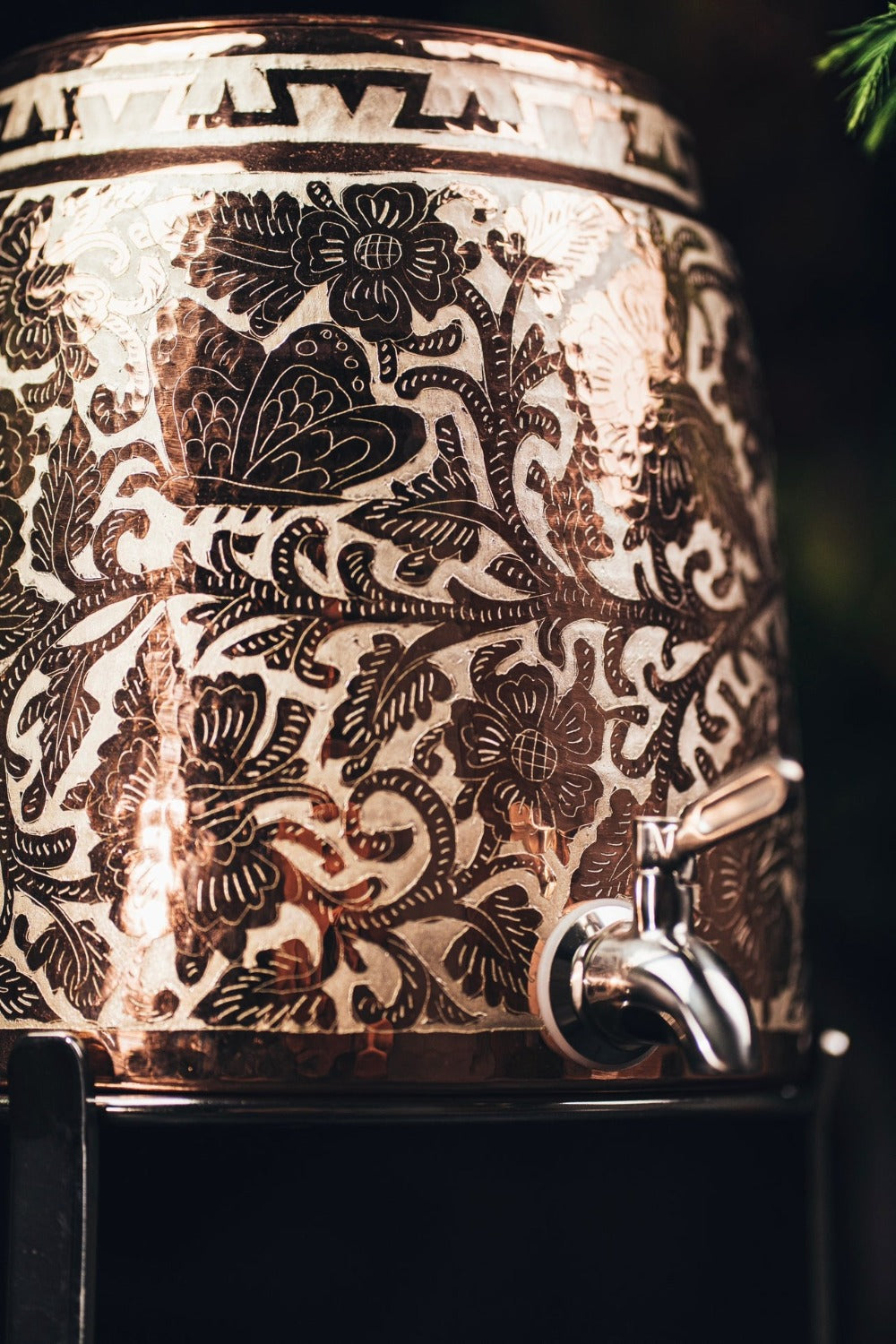 Our handcrafted, silver engraved copper water dispenser combines aesthetic beauty with exceptional functionality. Every detail reflects the skill of our Mexican artisans, providing both elegance and practicality in any environment. It is the ideal choice for those who appreciate traditional art and quality in every sip of fresh water.